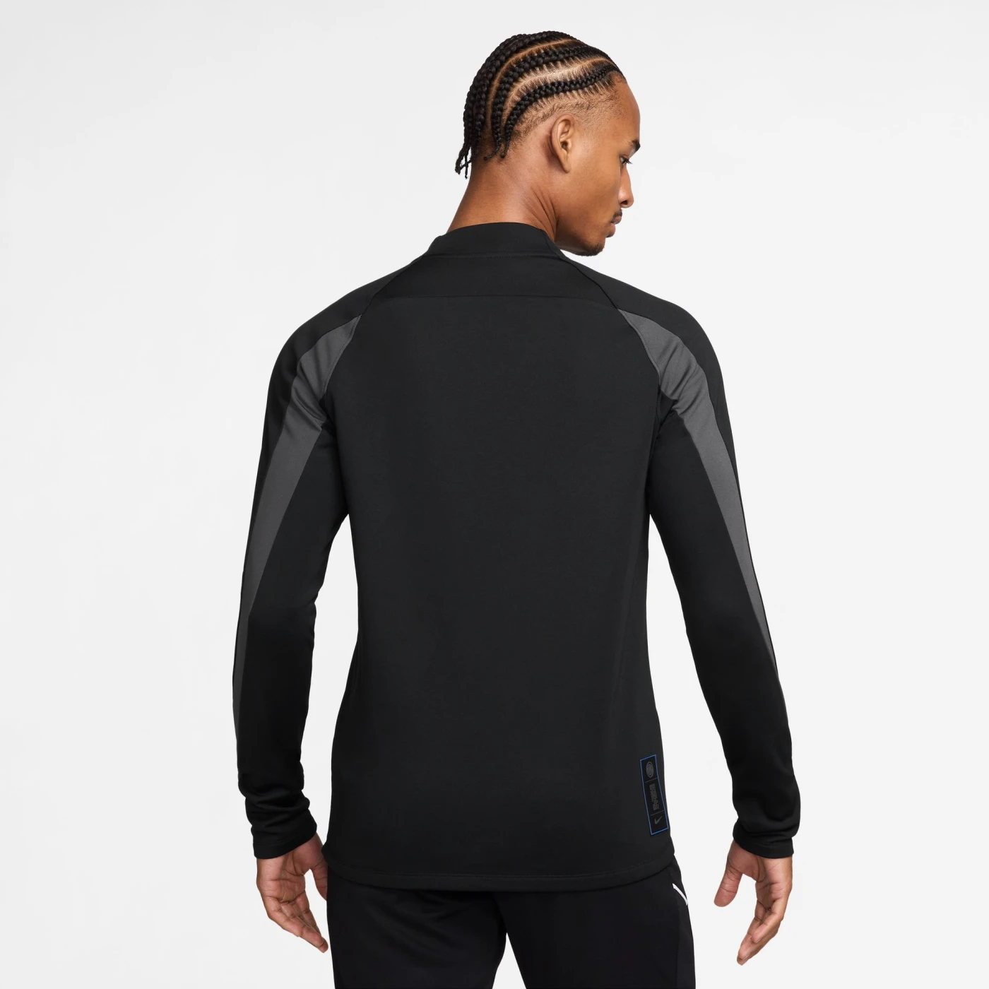 Designed to face the cold without compromising freedom of movement, the Inter Winter Warrior Drill Top 2025/26 combines thermal comfort and athletic performance in a modern, streamlined design. The padded front panel retains warmth where you need it most, while the stretch technical fabric on the sleeves and back ensures breathability and flexibility during activity. The Black base and Anthracite panel are enhanced by the INTER logo and Nike Swoosh in Lyon Blue, creating a sleek and distinctive contrast. Benefits – Padded front panel provides targeted warmth in cold conditions. – Stretch technical fabric allows optimal freedom of movement. – High collar and half-zip design for adjustable coverage. – Water-repellent finish helps protect from light rain and wind. Product details – Quilted front insert – Elastic cuffs – 100% polyester – Machine washable – Imported – Color shown: Black / Anthracite / Lyon Blue – Official Inter | Nike product