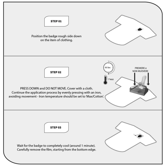 Celebrate the victory of our twentieth Scudetto and the second star with a commemorative patch. The patch can be applied at home using an iron. STEP 1: Position the patch rough-side down on the item of clothing. STEP 2: Cover with a cloth. Continue the application process by evenly pressing with an iron, avoiding movement (iron temperature should be set to ‘Max/Cotton’). STEP 3: Wait for the patch to completely cool (around 1 minute), then carefully remove the film, starting from the bottom edge.