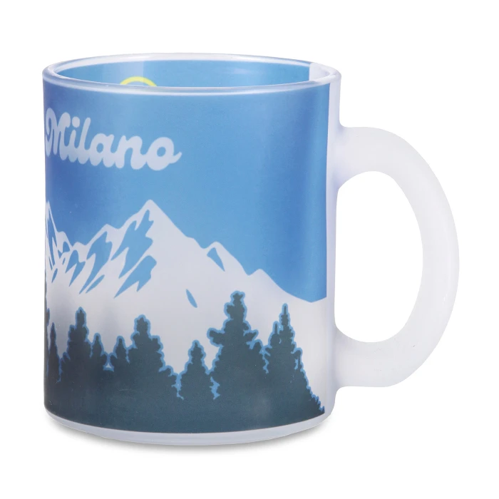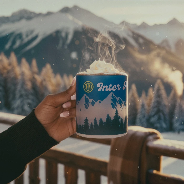 Bring a touch of Nerazzurri winter spirit to your day with the Inter glass mug, featuring snow-covered mountains and the Inter Milano wordmark. Perfect for cozy breakfasts or warm breaks in style.