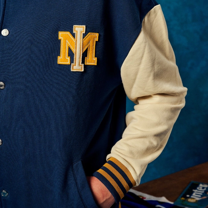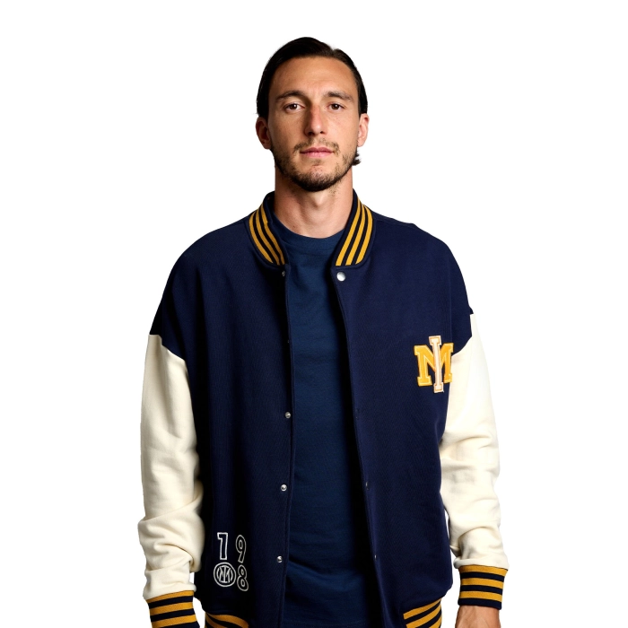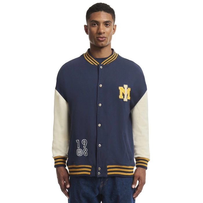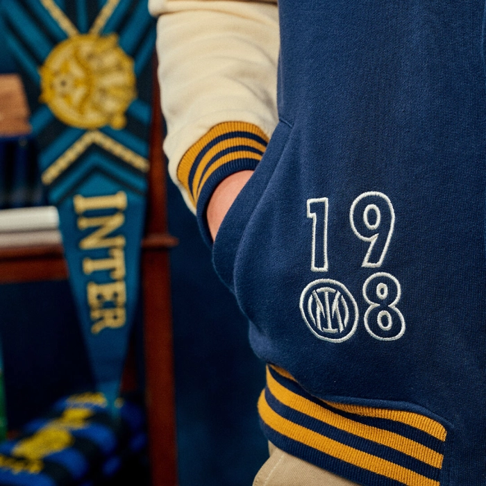 The College varsity sweatshirt features a new take on the IM logo in felt and embroidery on the chest, and INTER in College style on the back. It has a closure with custom metal buttons.