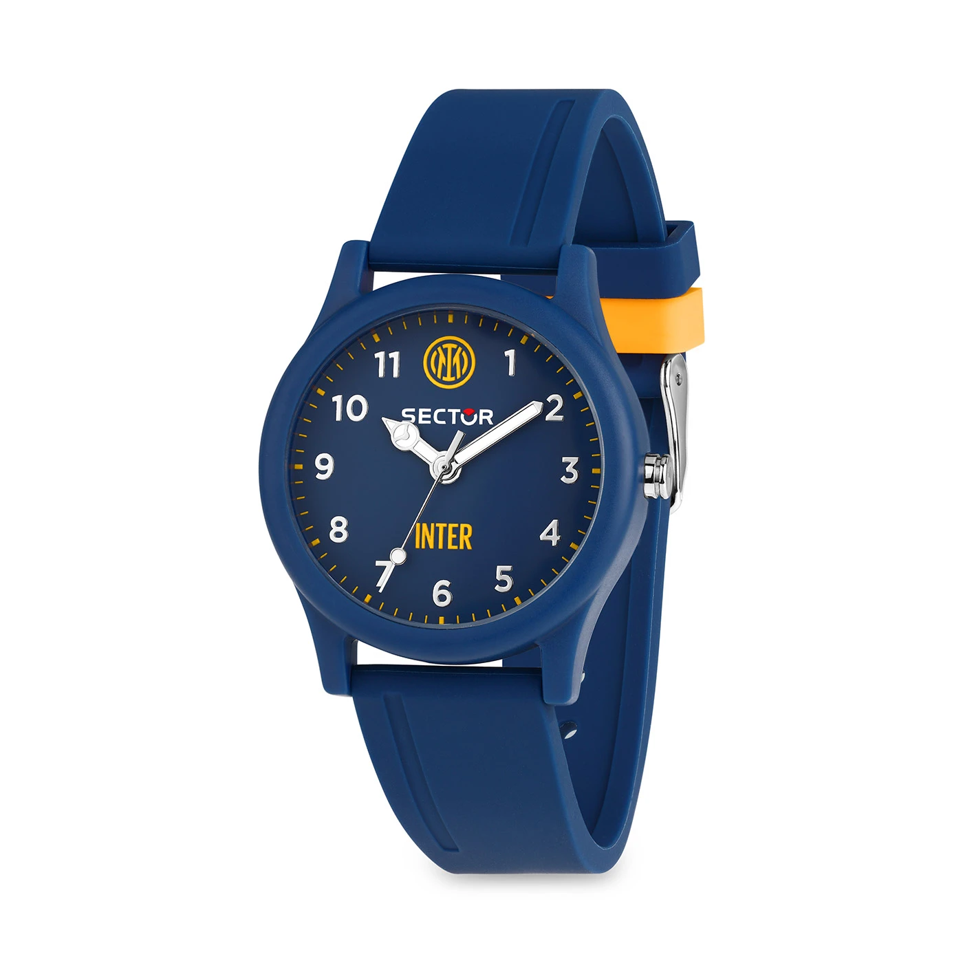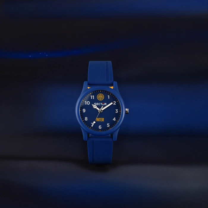 "Essential design and everyday functionality come together in this Sector three-hand watch dedicated to Inter. The stainless steel case and blue silicone strap ensure lightness and comfort, while the blue dial with clear indexes, orange details, and luminous hands provides immediate time readability. A versatile watch, perfect for those who love a discreet style with a sporty character."