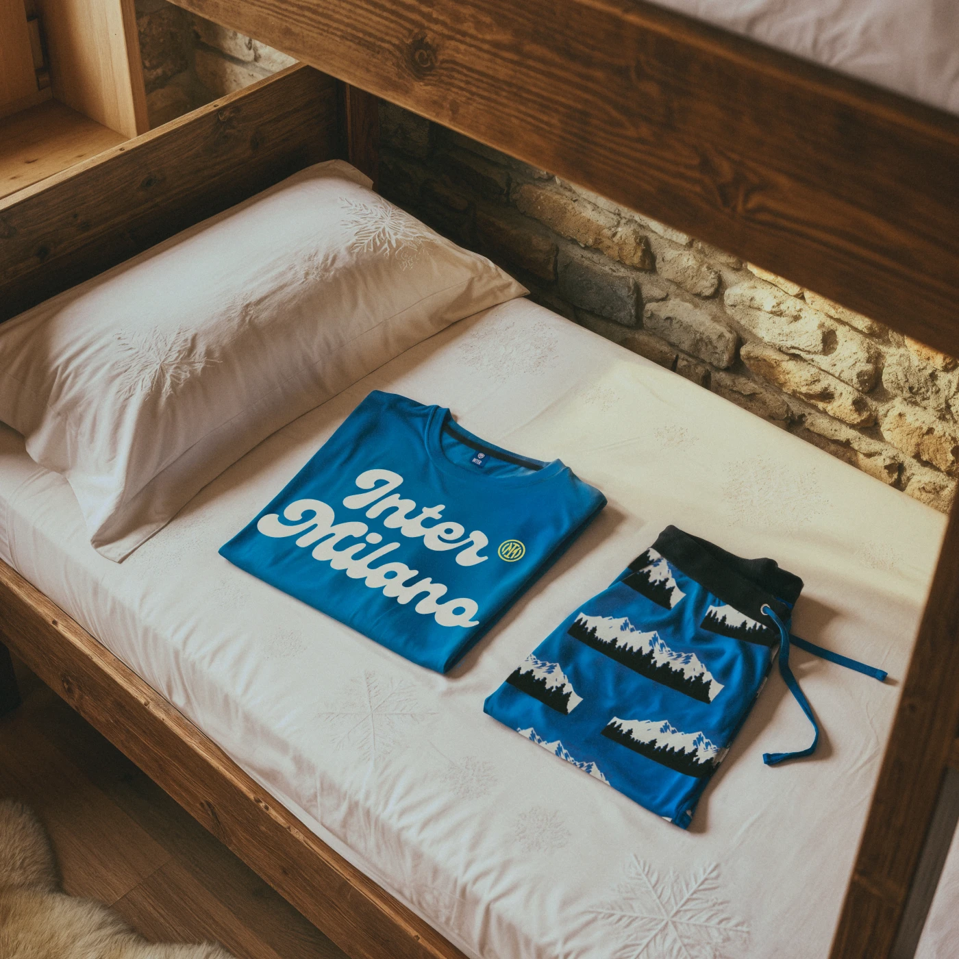 The INTER Winter Holidays Pyjamas 25/26 for men are perfect for colder nights, always with Nerazzurri style. Made of 100% cotton, they ensure comfort and breathability. The blue top features “Inter Milano” with the crest, while the pants are decorated with an all-over snowy mountain pattern. Cozy, warm, and ideal for winter nights as a true fan.