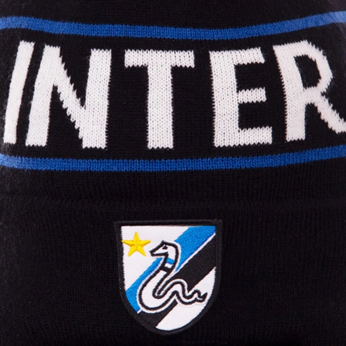 The Retro Taper Beanie is made from very soft fabric. The INTER text and blue stripes are knitted. On the front, it features an embroidered retro club logo with the Biscione and the text INTER.