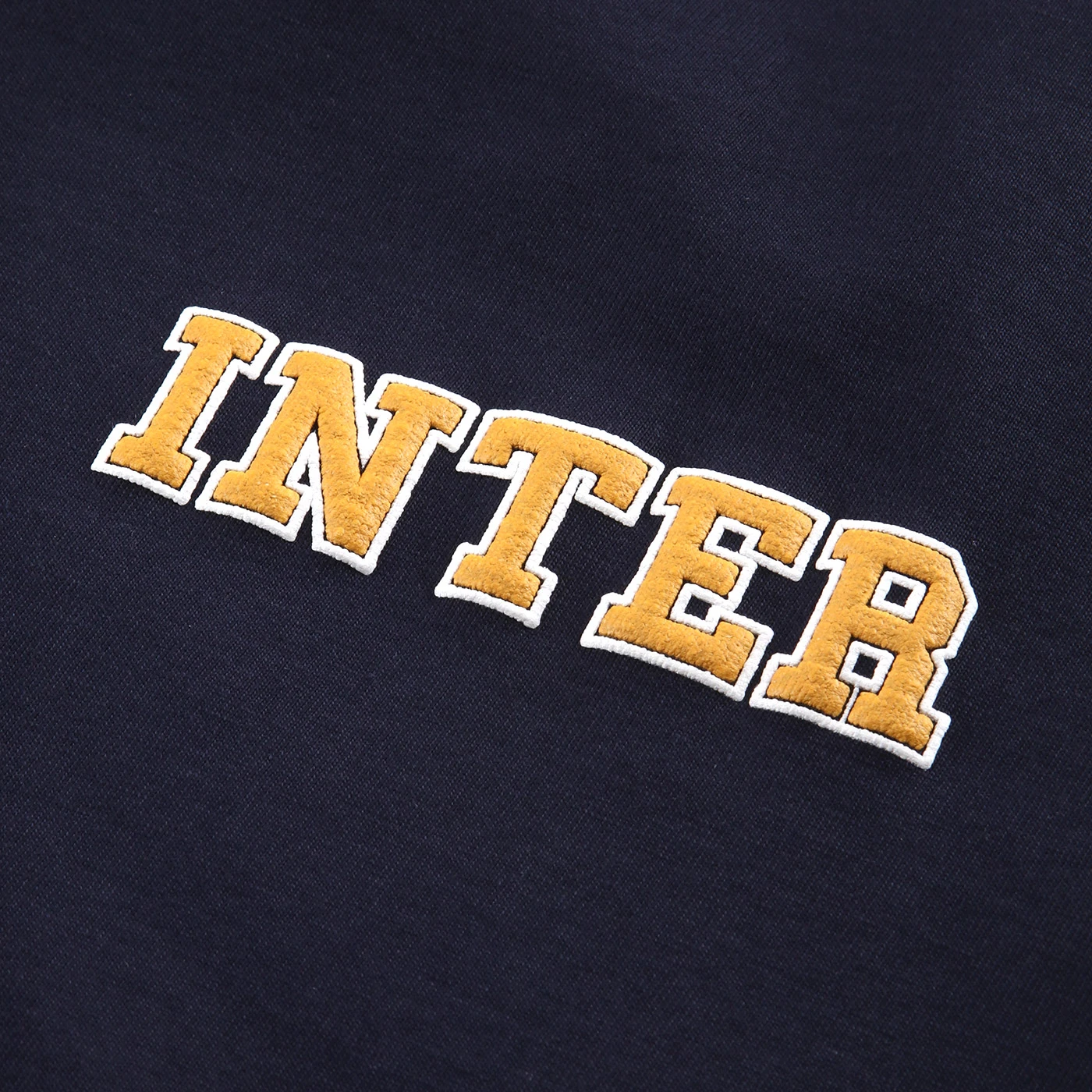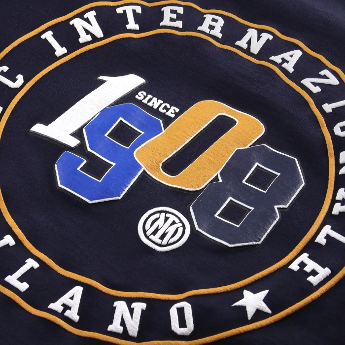The front features the bold “INTER” lettering, while the back showcases a raised circular graphic with the date “1908” - a tribute to the club’s founding year - along with “Milano”, the club’s name and crest. The design is enhanced by contrasting details on the collar and sleeves with a repeated graphic pattern, adding a distinctive and authentic touch.