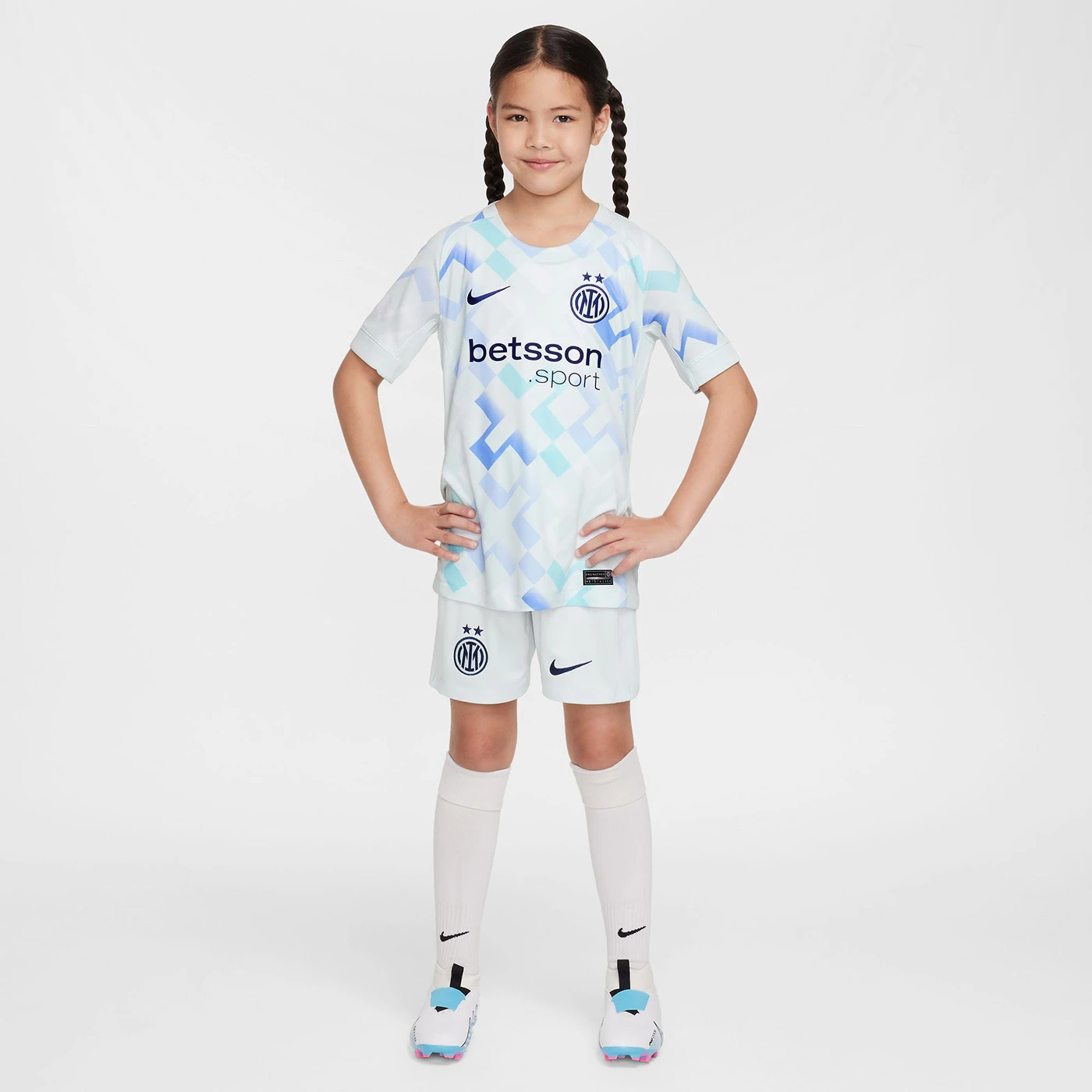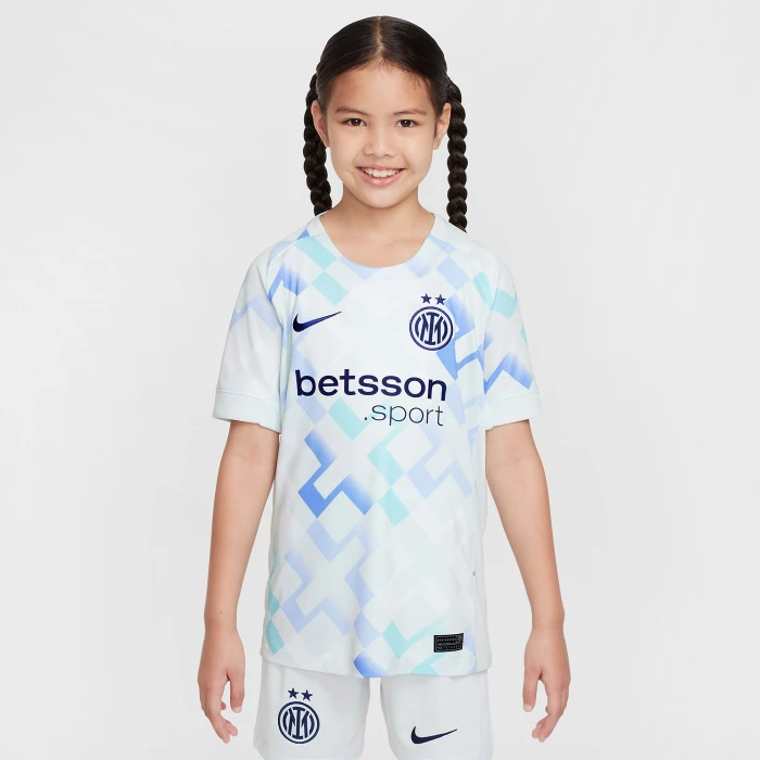 The new Inter Away Kids Jersey 2025/26, designed by Nike, pays tribute to the Club’s founding principles: inclusion and diversity.The woven pattern, inspired by artisanal textiles, symbolizes community and collective strength — values that have always been at the heart of Inter.Part of the Stadium collection, this jersey replicates the details of the original design, with a fit tailored for young fans who want to experience the thrill of match day in true Inter style.Made from 100% recycled polyester, it features Nike Dri-FIT technology that wicks away sweat for faster evaporation, keeping the skin dry and ensuring lasting comfort on and off the pitch.The kit is completed by matching shorts and socks. The jersey can be customized with the name and number of a favorite player and enriched with the official Serie A 2025/26 or UEFA Champions League patches.Product details:Stadium collection – replica designWoven pattern inspired by artisanal textilesNike Dri-FIT technology for breathability and comfort100% recycled polyester fabricWoven crest + inner collar detailMachine washableColor: Ghost Aqua / White / Blue Void